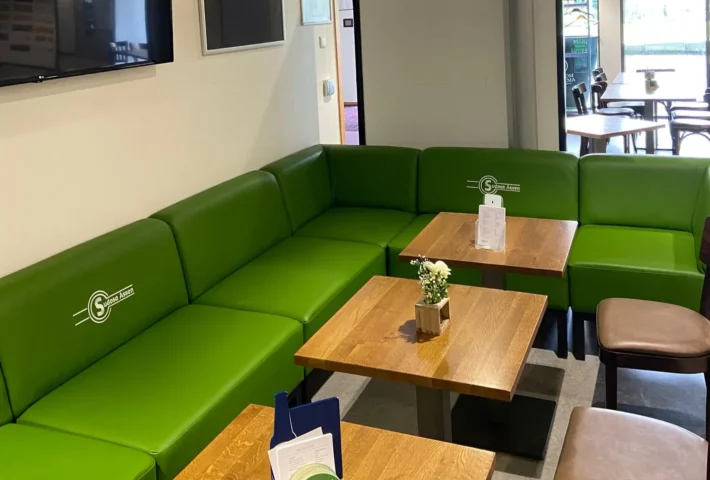 De oude grijze stof maakte plaats voor een frisse, basilicumgroene bekleding – helemaal passend bij de sportieve sfeer in de kantine.